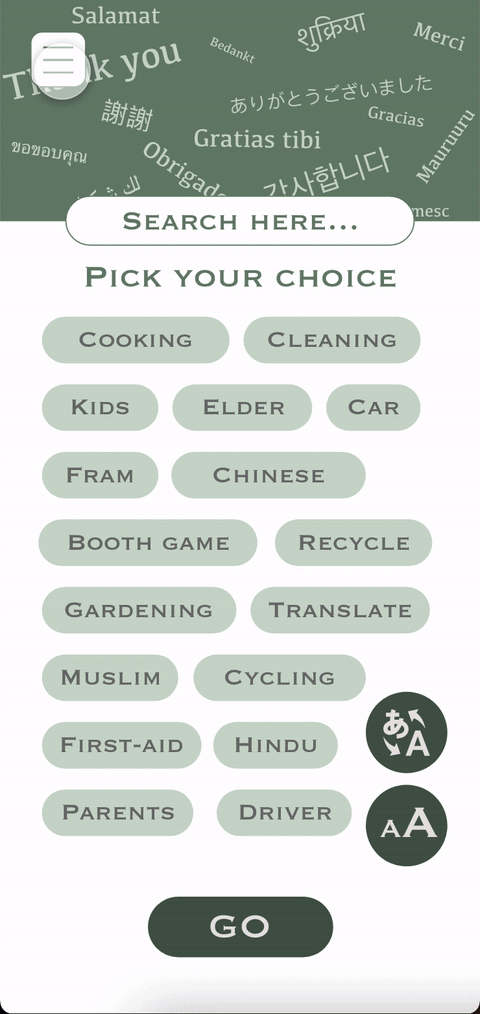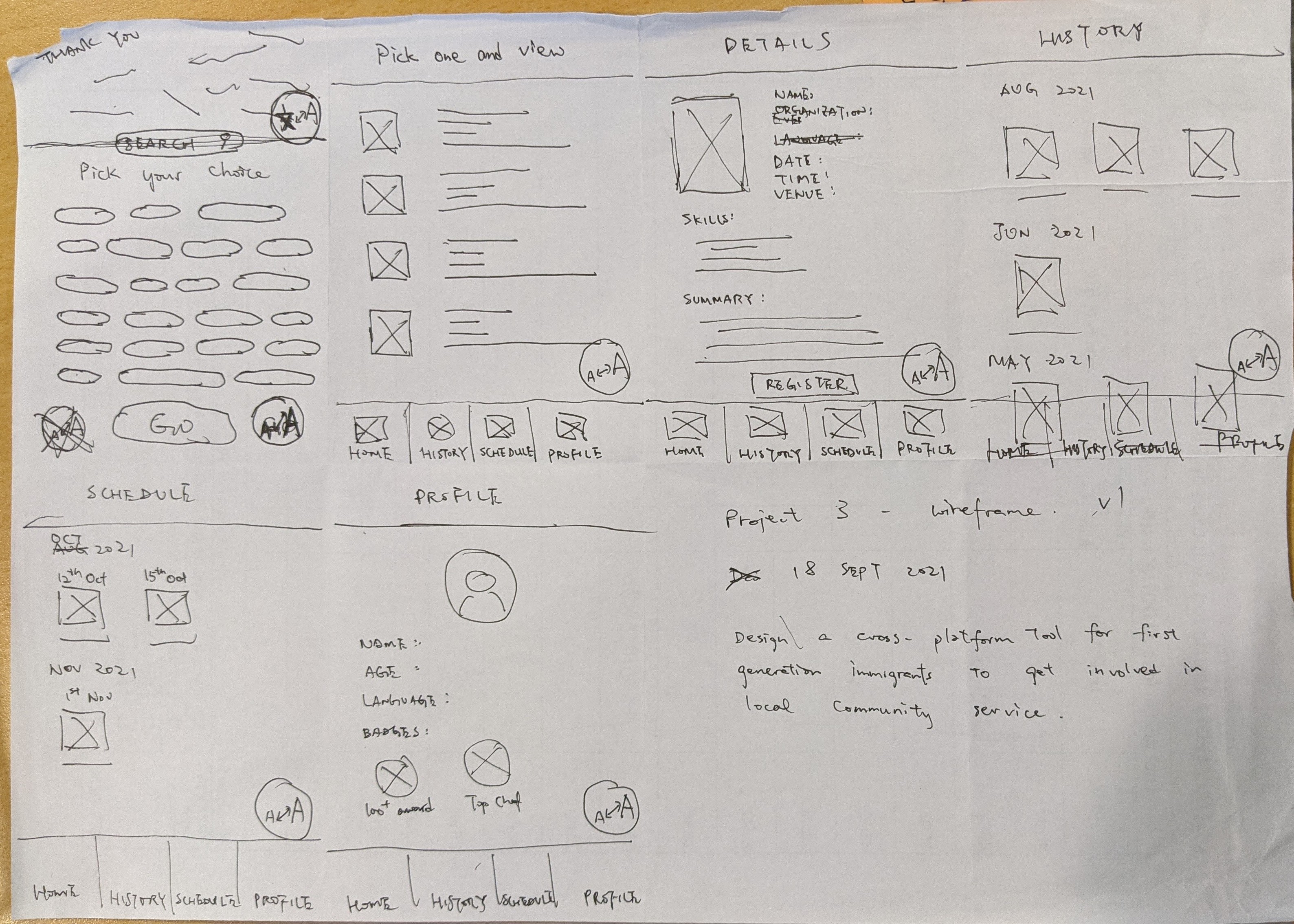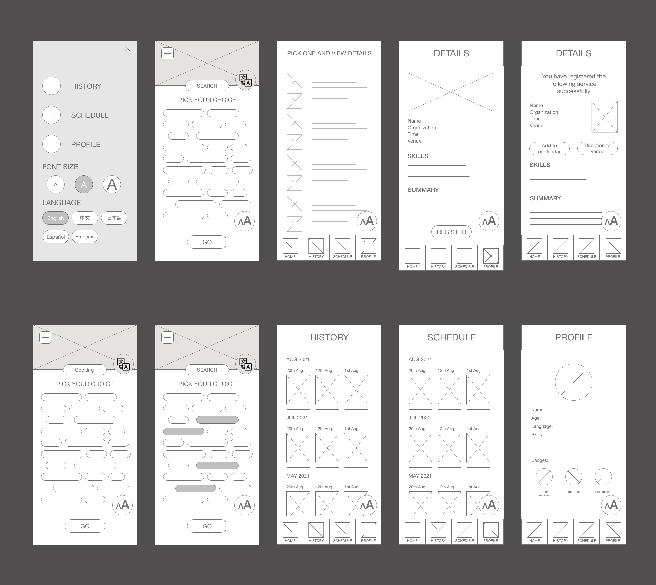 As this apps is targeted for new immigrants to participate in local community service, there are quite some assessibility concern. Based on the research we did before, many of the users maybe elderly which do not familiar with technology. And quite a large number of them do need a bigger font size and difficulties using English as media. We focused on these two major pain points and put a call to action button front and obvious on every pages so to ease out their worries.